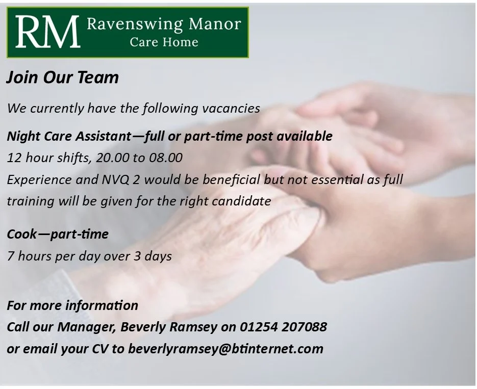 Please call our Manager, Beverly Ramsey on 01254 207088 or email your CV to beverlyramsey@btinternet.com