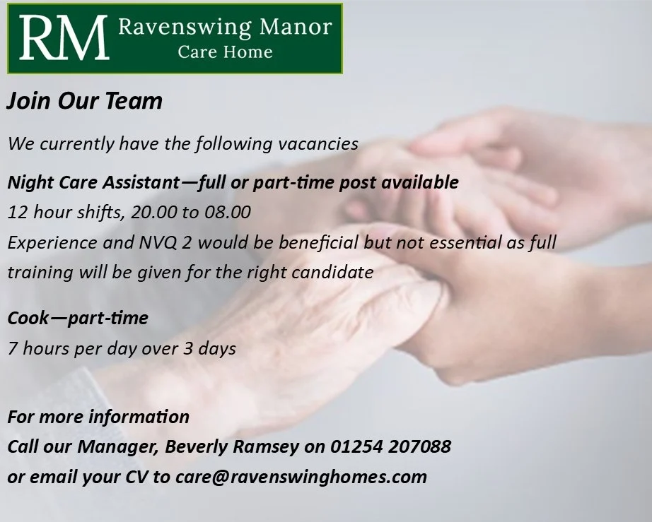 Please call our Manager, Beverly Ramsey on 01254 207088 or email your CV to care@ravenswinghomes.com
