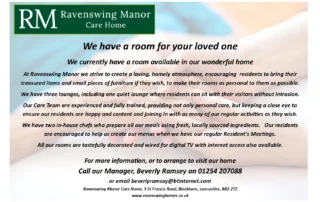 We currently have a cosy and comfortable room for your loved one. Please call our Manager, Beverly Ramsey on 01254 207088 to arrange a visit.